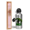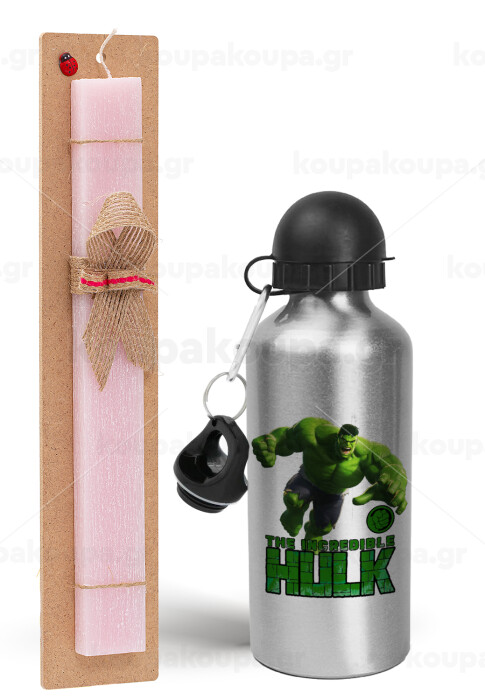 Hulk, Easter Set, metallic Silver aluminum water bottle (500ml) & scented flat Easter candle (30cm) (PINK)