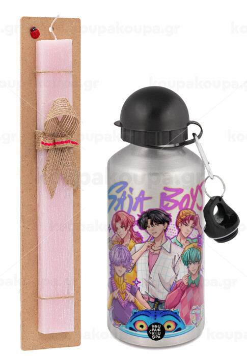 Huntrix Saja Boys, Easter Set, metallic Silver aluminum water bottle (500ml) & scented flat Easter candle (30cm) (PINK)