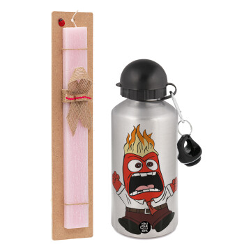 Inside Out Angry, Easter Set, metallic Silver aluminum water bottle (500ml) & scented flat Easter candle (30cm) (PINK)