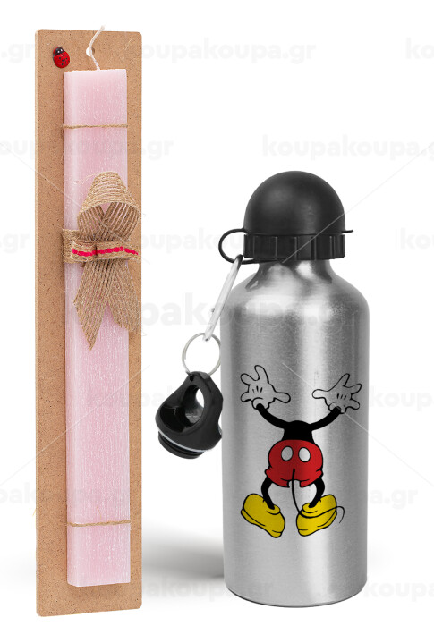Mickey hide..., Easter Set, metallic Silver aluminum water bottle (500ml) & scented flat Easter candle (30cm) (PINK)