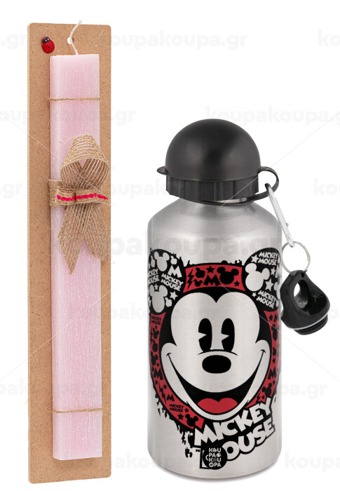 Mickey Mouse, Easter Set, metallic Silver aluminum water bottle (500ml) & scented flat Easter candle (30cm) (PINK)