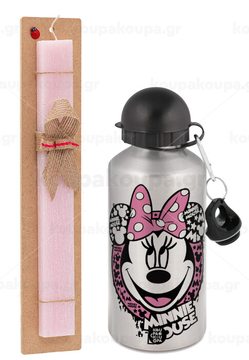 Minnie mouse, Easter Set, metallic Silver aluminum water bottle (500ml) & scented flat Easter candle (30cm) (PINK)