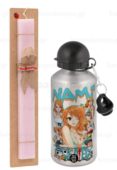 Nami One Piece, Easter Set, metallic Silver aluminum water bottle (500ml) & scented flat Easter candle (30cm) (PINK)