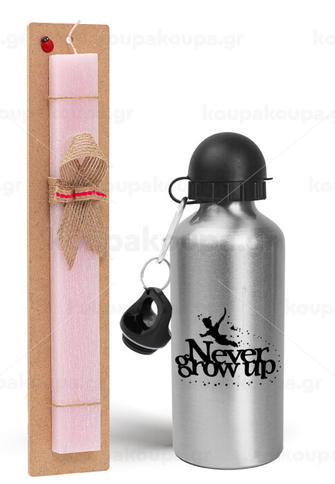 Peter pan, Never Grow UP, Easter Set, metallic Silver aluminum water bottle (500ml) & scented flat Easter candle (30cm) (PINK)