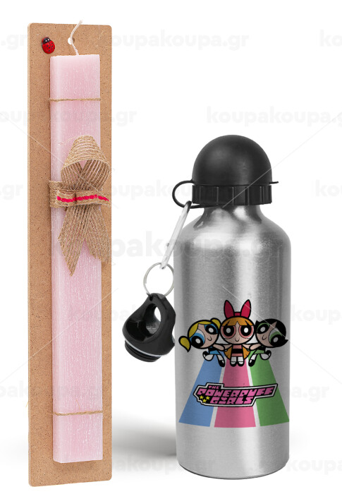 The powerpuff girls , Easter Set, metallic Silver aluminum water bottle (500ml) & scented flat Easter candle (30cm) (PINK)