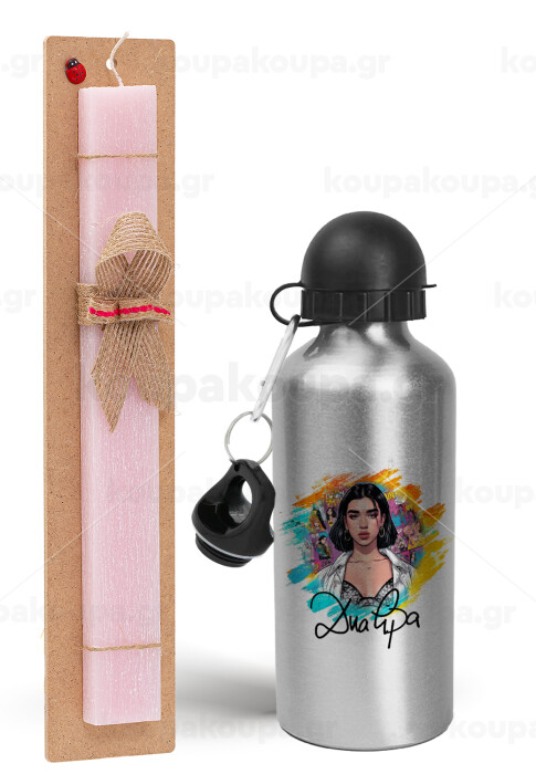 Dua lipa, Easter Set, metallic Silver aluminum water bottle (500ml) & scented flat Easter candle (30cm) (PINK)