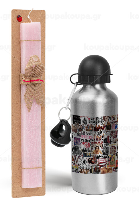 Maneskin stickers, Easter Set, metallic Silver aluminum water bottle (500ml) & scented flat Easter candle (30cm) (PINK)