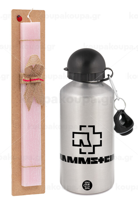 Rammstein, Easter Set, metallic Silver aluminum water bottle (500ml) & scented flat Easter candle (30cm) (PINK)