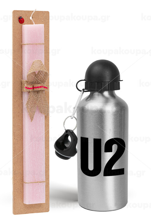 U2 , Easter Set, metallic Silver aluminum water bottle (500ml) & scented flat Easter candle (30cm) (PINK)