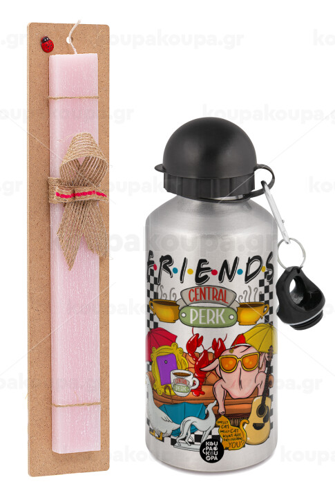 Friends, Easter Set, metallic Silver aluminum water bottle (500ml) & scented flat Easter candle (30cm) (PINK)