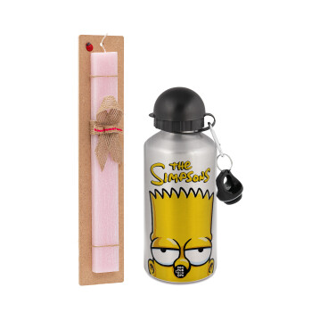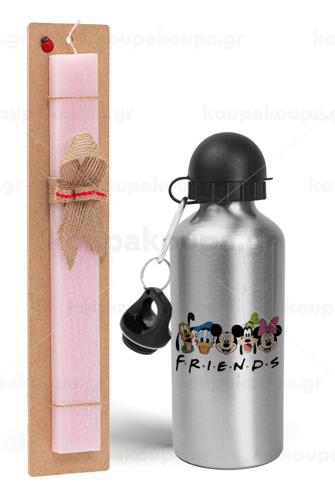 Friends characters, Easter Set, metallic Silver aluminum water bottle (500ml) & scented flat Easter candle (30cm) (PINK)
