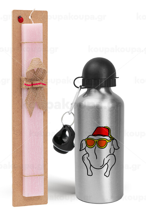 Friends turkey, Easter Set, metallic Silver aluminum water bottle (500ml) & scented flat Easter candle (30cm) (PINK)