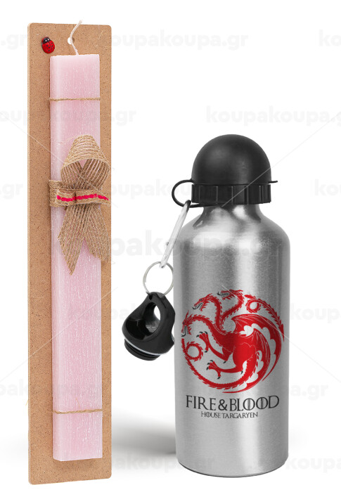 GOT House Targaryen, Fire Blood, Easter Set, metallic Silver aluminum water bottle (500ml) & scented flat Easter candle (30cm) (PINK)