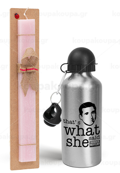The office Michael That's what she said, Easter Set, metallic Silver aluminum water bottle (500ml) & scented flat Easter candle (30cm) (PINK)