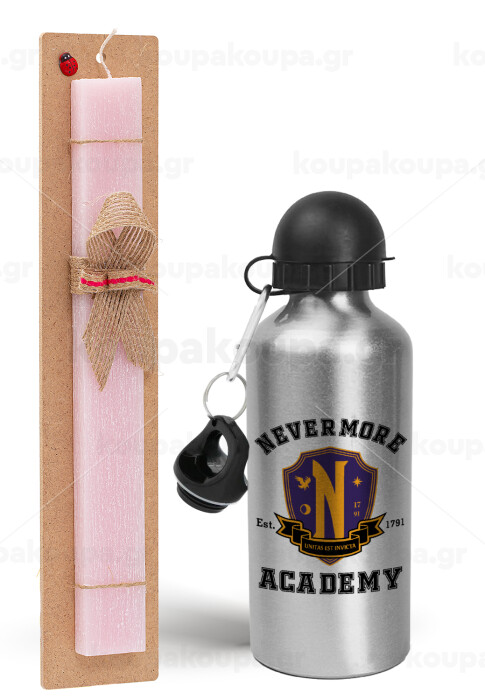Wednesday Nevermore Academy University, Easter Set, metallic Silver aluminum water bottle (500ml) & scented flat Easter candle (30cm) (PINK)