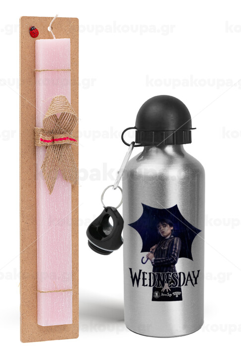 Wednesday rain, Easter Set, metallic Silver aluminum water bottle (500ml) & scented flat Easter candle (30cm) (PINK)