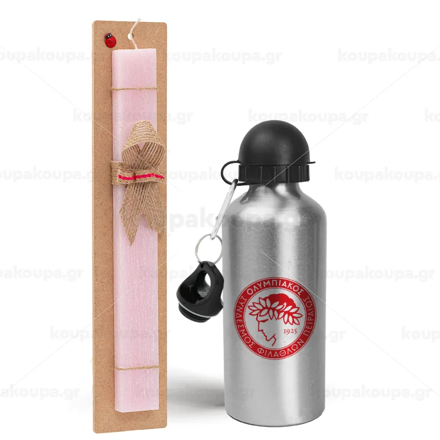 Ολυμπιακός, Easter Set, metallic Silver aluminum water bottle (500ml) & scented flat Easter candle (30cm) (PINK)
