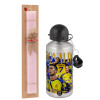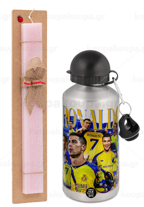 Cristiano Ronaldo Al Nassr, Easter Set, metallic Silver aluminum water bottle (500ml) & scented flat Easter candle (30cm) (PINK)