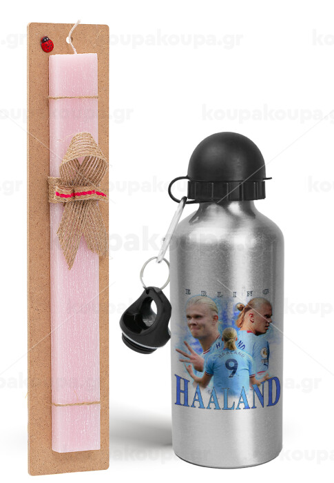 Erling Haaland, Easter Set, metallic Silver aluminum water bottle (500ml) & scented flat Easter candle (30cm) (PINK)