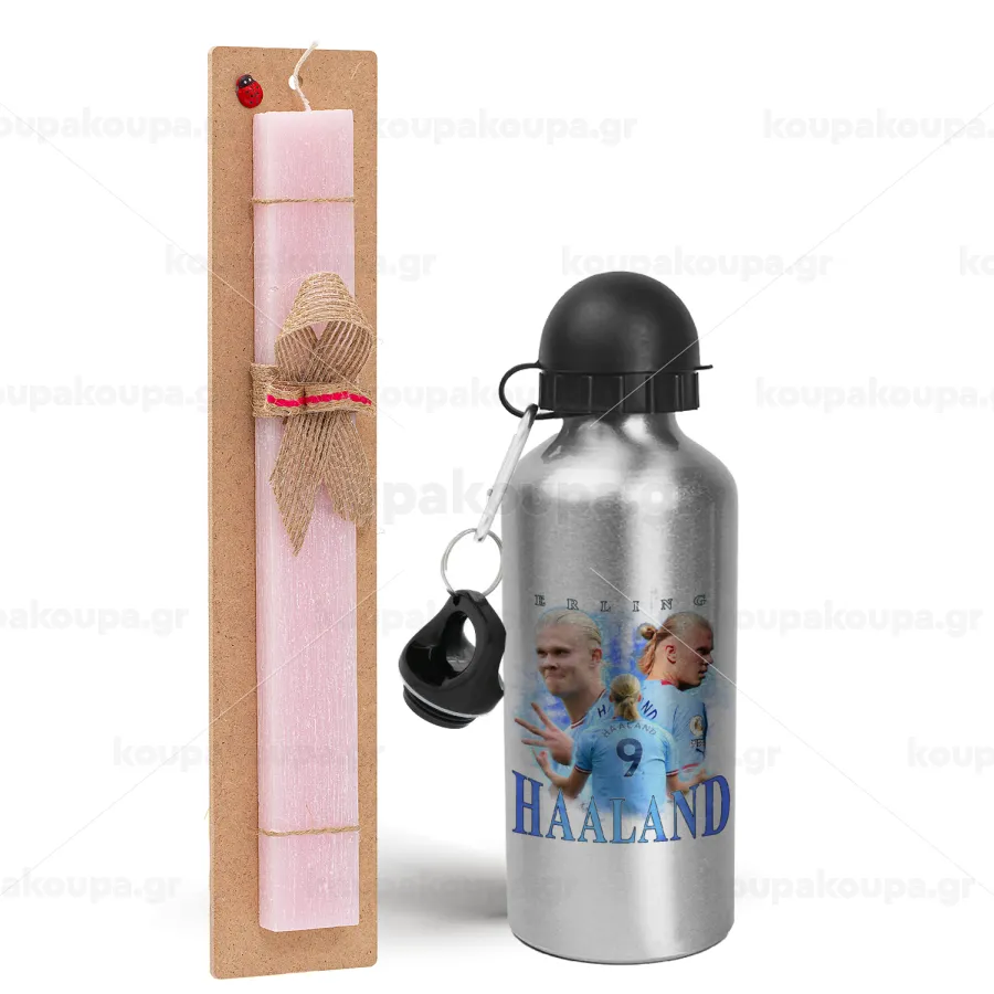 Erling Haaland, Easter Set, metallic Silver aluminum water bottle (500ml) & scented flat Easter candle (30cm) (PINK)