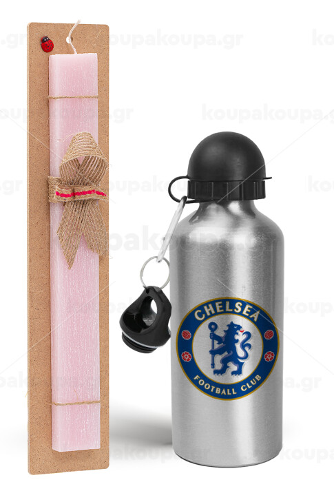 FC Chelsea, Easter Set, metallic Silver aluminum water bottle (500ml) & scented flat Easter candle (30cm) (PINK)