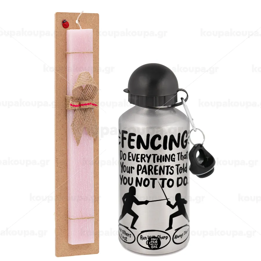 Fencing, do everything that your parents told you not to do., Easter Set, metallic Silver aluminum water bottle (500ml) & scented flat Easter candle (30cm) (PINK)