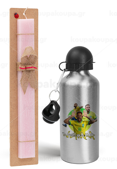 Neymar JR, Easter Set, metallic Silver aluminum water bottle (500ml) & scented flat Easter candle (30cm) (PINK)