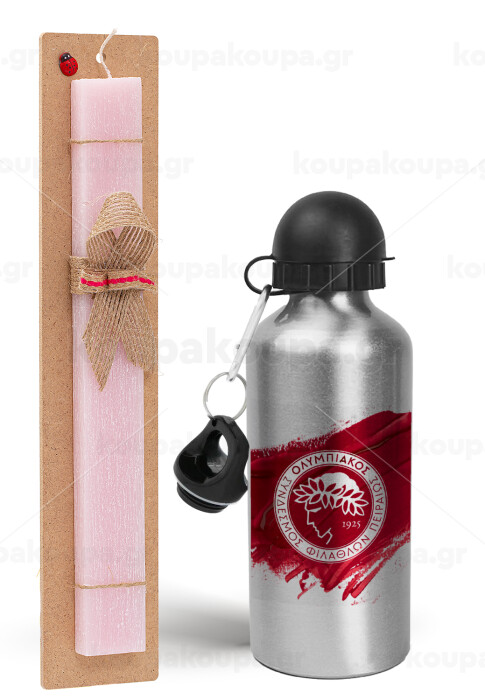 Olympiacos F.C., Easter Set, metallic Silver aluminum water bottle (500ml) & scented flat Easter candle (30cm) (PINK)