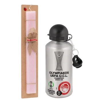 Olympiacos UEFA Europa Conference League Champion 2023/24, Easter Set, metallic Silver aluminum water bottle (500ml) & scented flat Easter candle (30cm) (PINK)