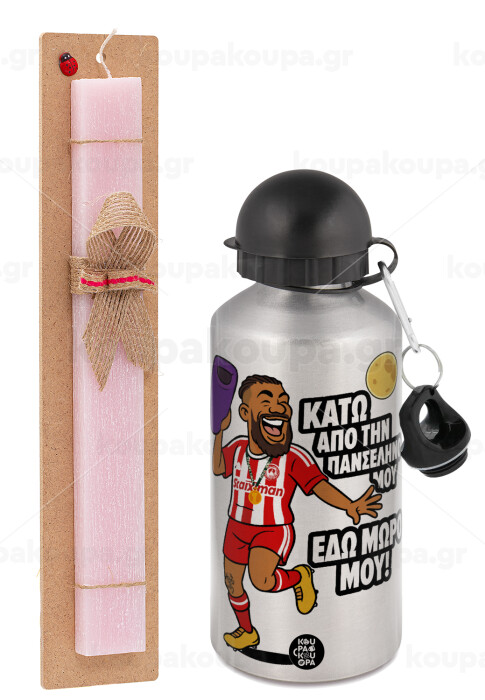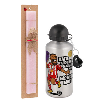 Ροντινέι, "ΚΑΤΩ ΑΠΟ ΤΗΝ ΠΑΝΣΕΛΗΝΟ ΜΟΥ!", Easter Set, metallic Silver aluminum water bottle (500ml) & scented flat Easter candle (30cm) (PINK)