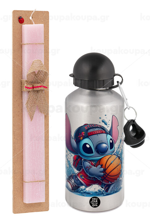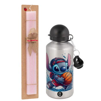 Stitch Basketball, Easter Set, metallic Silver aluminum water bottle (500ml) & scented flat Easter candle (30cm) (PINK)