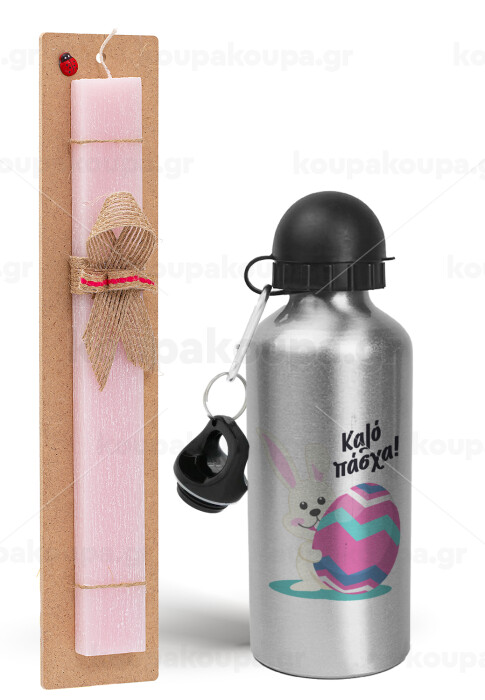Καλό πάσχα, Easter Set, metallic Silver aluminum water bottle (500ml) & scented flat Easter candle (30cm) (PINK)