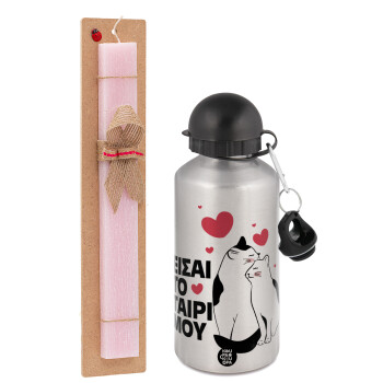 Είσαι το ταίρι μου, Easter Set, metallic Silver aluminum water bottle (500ml) & scented flat Easter candle (30cm) (PINK)