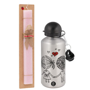 Hold my hand for ever, Easter Set, metallic Silver aluminum water bottle (500ml) & scented flat Easter candle (30cm) (PINK)
