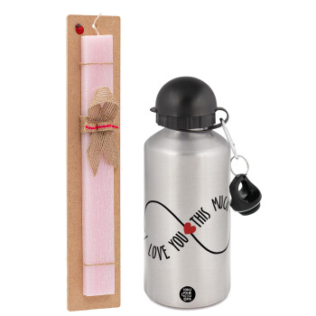 I Love you thisssss much (infinity), Easter Set, metallic Silver aluminum water bottle (500ml) & scented flat Easter candle (30cm) (PINK)