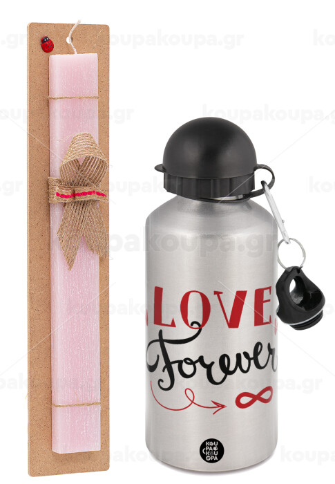 Love forever ∞, Easter Set, metallic Silver aluminum water bottle (500ml) & scented flat Easter candle (30cm) (PINK)