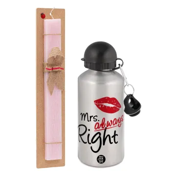 Mrs always right kiss, Easter Set, metallic Silver aluminum water bottle (500ml) & scented flat Easter candle (30cm) (PINK)