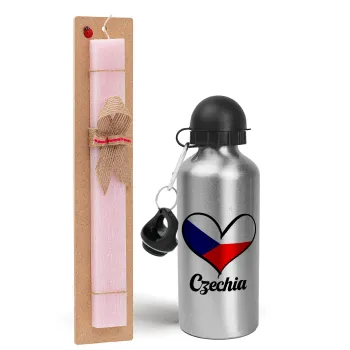 Czechia flag, Easter Set, metallic Silver aluminum water bottle (500ml) & scented flat Easter candle (30cm) (PINK)