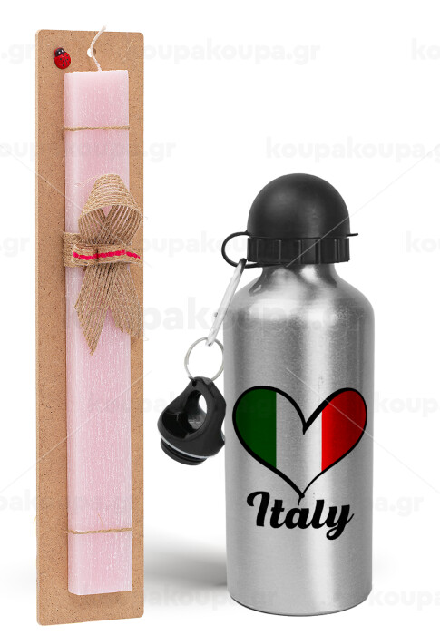 Italy flag, Easter Set, metallic Silver aluminum water bottle (500ml) & scented flat Easter candle (30cm) (PINK)