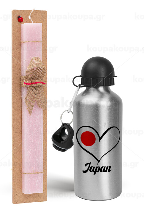 Japan flag, Easter Set, metallic Silver aluminum water bottle (500ml) & scented flat Easter candle (30cm) (PINK)