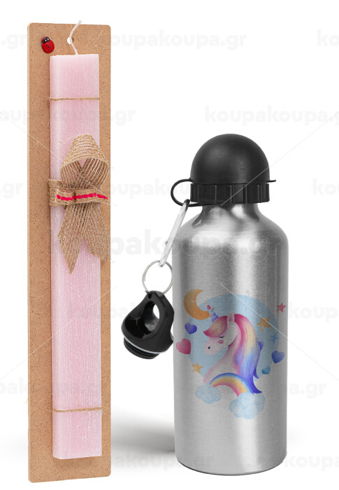 Cute unicorn, Easter Set, metallic Silver aluminum water bottle (500ml) & scented flat Easter candle (30cm) (PINK)