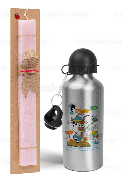 Kids Fisherman, Easter Set, metallic Silver aluminum water bottle (500ml) & scented flat Easter candle (30cm) (PINK)