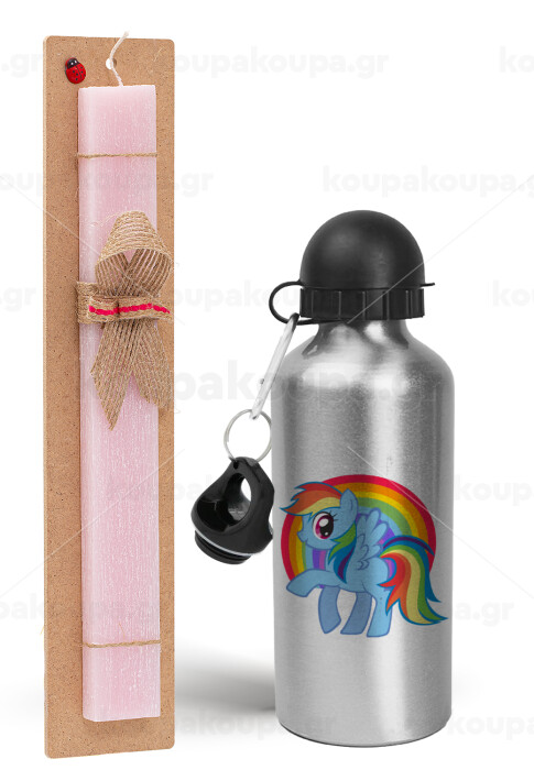 My Little Pony, Easter Set, metallic Silver aluminum water bottle (500ml) & scented flat Easter candle (30cm) (PINK)