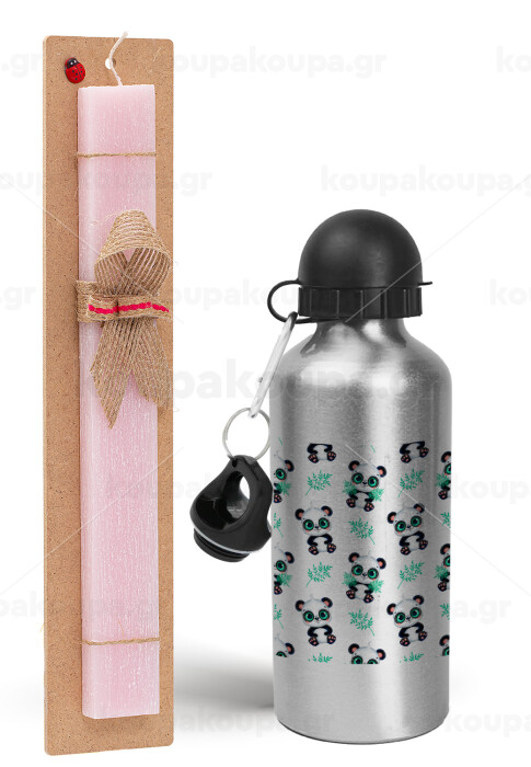 Panda, Easter Set, metallic Silver aluminum water bottle (500ml) & scented flat Easter candle (30cm) (PINK)
