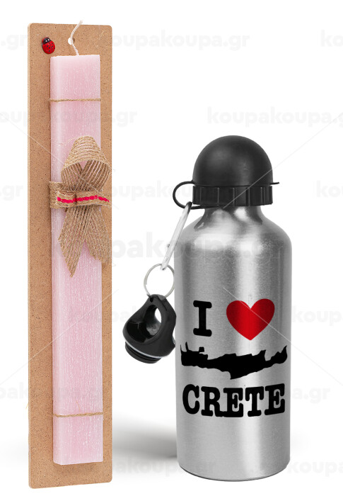 I Love Crete, Easter Set, metallic Silver aluminum water bottle (500ml) & scented flat Easter candle (30cm) (PINK)