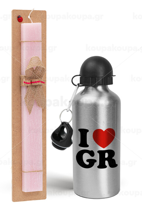 I Love GR, Easter Set, metallic Silver aluminum water bottle (500ml) & scented flat Easter candle (30cm) (PINK)