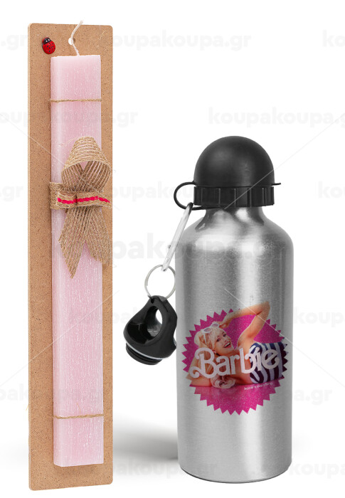 Barbie is everything, Easter Set, metallic Silver aluminum water bottle (500ml) & scented flat Easter candle (30cm) (PINK)