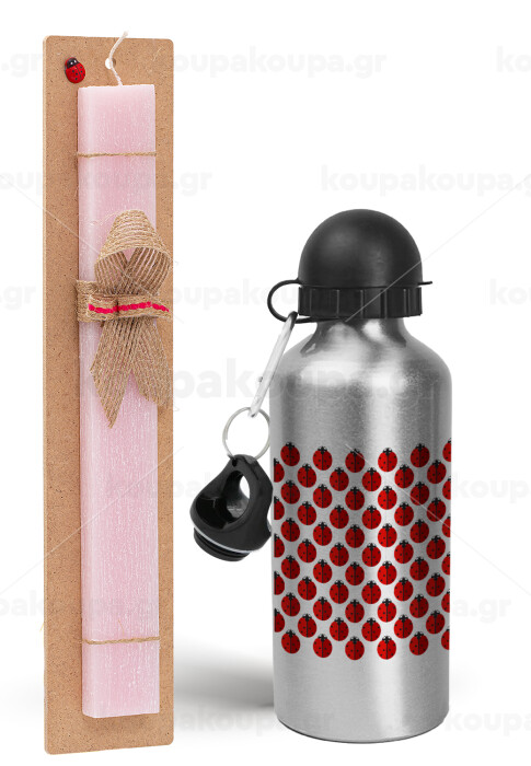 Coccinella, Easter Set, metallic Silver aluminum water bottle (500ml) & scented flat Easter candle (30cm) (PINK)