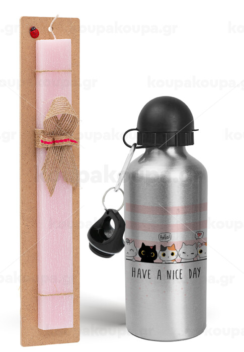 Have a nice day cats, Easter Set, metallic Silver aluminum water bottle (500ml) & scented flat Easter candle (30cm) (PINK)