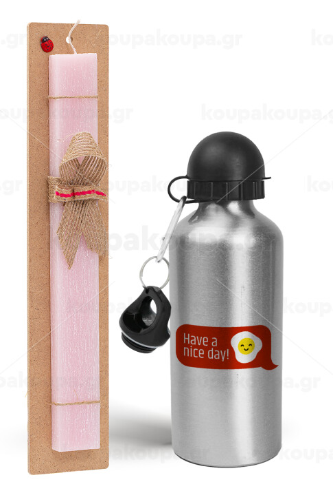 Have a nice day Emoji, Easter Set, metallic Silver aluminum water bottle (500ml) & scented flat Easter candle (30cm) (PINK)